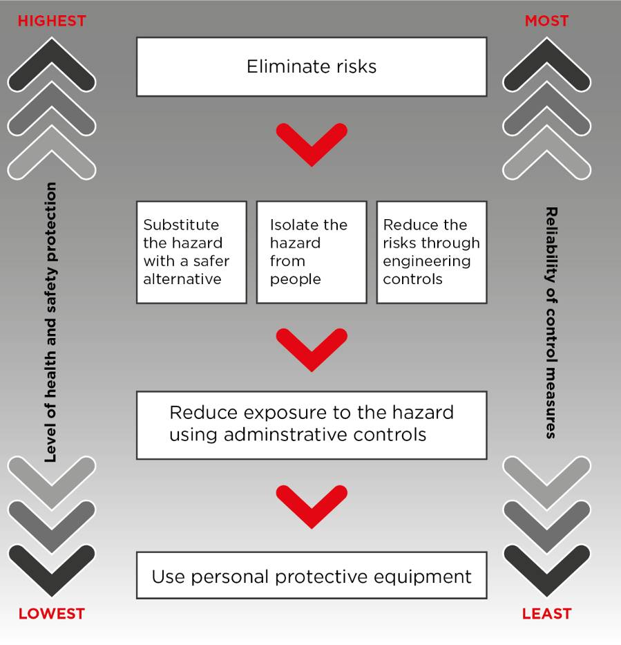 This is a model for managing occupational hazards in the workplace. The hierarchy ranks risk avoidance and risk mitigation strategies in decreasing order of reliability. Multiple control strategies are required to eliminate or minimise the risk of infection.