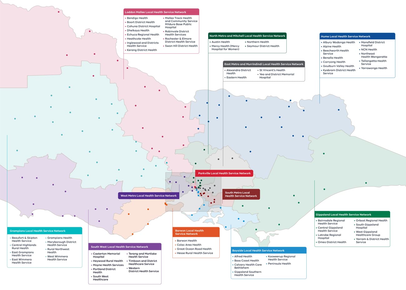 On 1 July, 2025, Victoria’s Local Health Service Networks (Networks) were officially established. The Networks group health services within a geographical region and are responsible for supporting collaborative care for their community, as close to home as possible. They are a key recommended pillar of reform in the Health Services Plan.