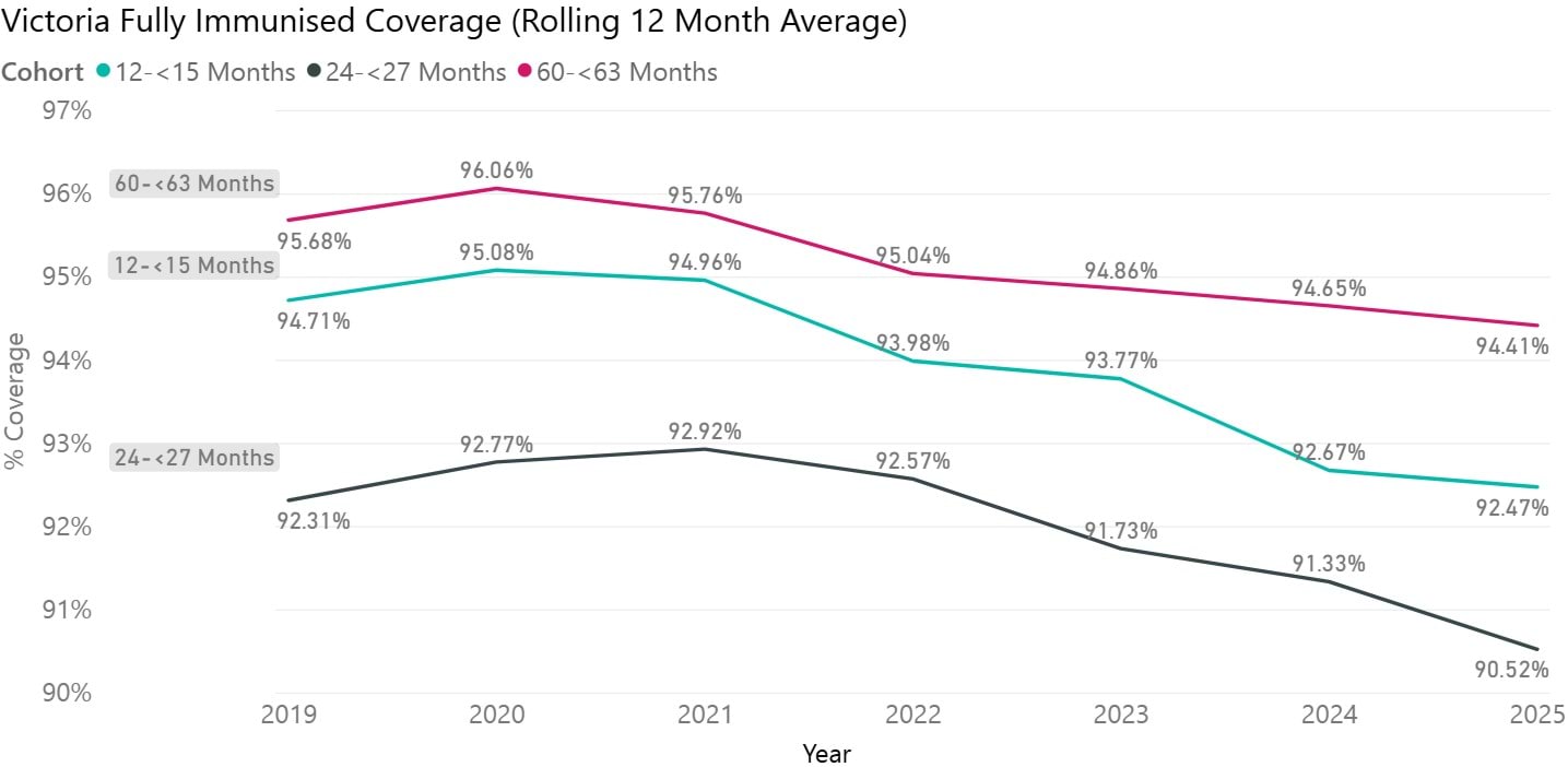 Vaccination coverage rates are provided by the Australian Immunisation Register(opens in a new window) according to the National Immunisation Program Schedule(opens in a new window).
